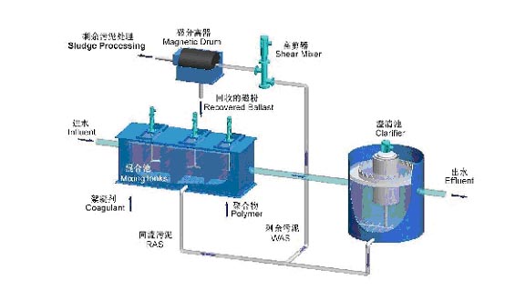 磁鐵粉的回收在應(yīng)用問題,國外采用三種方法。一是用大離心力的旋流分離器可回收75-98%的磁鐵粉;二是利用超聲裝置,用強剪力使磁鐵粉與絮凝體分離,但運轉(zhuǎn)費用高;三是用泵使反洗水高速送入另一套高磁分離裝置,磁鐵粉即被捕捉與反洗水分離,使磁鐵粉能循環(huán)使用。該系統(tǒng)包括絮凝、磁分離、反洗、濃縮、磁種回收等,可全部自動化。
