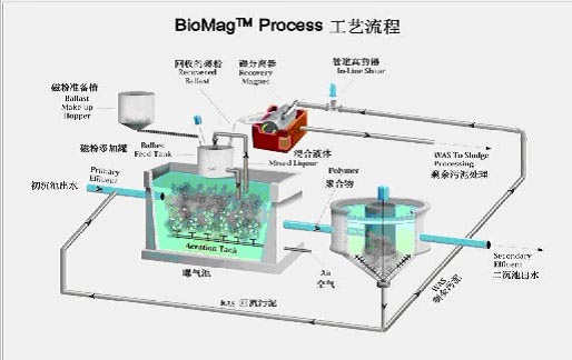BioMag工藝是是繼CoMag工藝之后推出的一項通過向生物絮體添加磁粉來提高污水生化處理的工藝。經(jīng)BioMag工藝處理過的水,其懸浮物、生化需氧量、氮和磷的濃度都比較低,且所需的占地面積相對常規(guī)生化系統(tǒng)較小。BioMag工藝可以大大減小生物反應(yīng)器的容積,顯著降低去除BOD以及脫氮所需的占地面積。BioMag工藝的首要特點是,它在增加二沉池內(nèi)的沉降速度和濃縮污泥層方面能力顯著。具體流程如圖2。