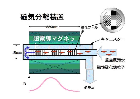 2007年,日本首都大學(xué)東京大學(xué)院開發(fā)出利用磁性吸附劑去除廢水中磷的技術(shù)。日本首都大學(xué)的伊藤大佐教授等組成的研究小組開發(fā)出了有效去除廢水中磷的技術(shù)。利用超導(dǎo)磁體可以得到10特斯拉的磁場強度,再利用具有磁力的名為“鋯磁體”的金屬微粒,可去除99%以上的磷�?蓪⒘椎臐舛扔�0.86mg/L降到0.006mg/L。磁分離裝置原理圖見圖3。該技術(shù)目前用于小規(guī)模生活污水處理、霞浦湖富營養(yǎng)化治理、屠宰場廢水處理。